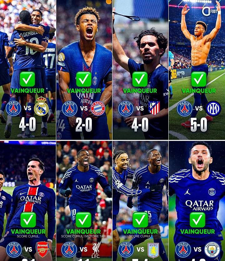 自1月23日逆转曼城开始,短短168天内,巴黎圣日耳曼接连战胜曼城、利物浦、阿斯顿维拉、阿森纳、国际米兰、马德里竞技、拜仁慕尼黑、皇马等欧洲强队,总比分高达28-8。本赛季,除了欧冠联赛外,他们还获得了法甲联赛、法国杯和法国超级杯的冠军,并成功晋级世俱杯决赛。如果能战胜切尔西,将实现“五冠王”的伟大成就。