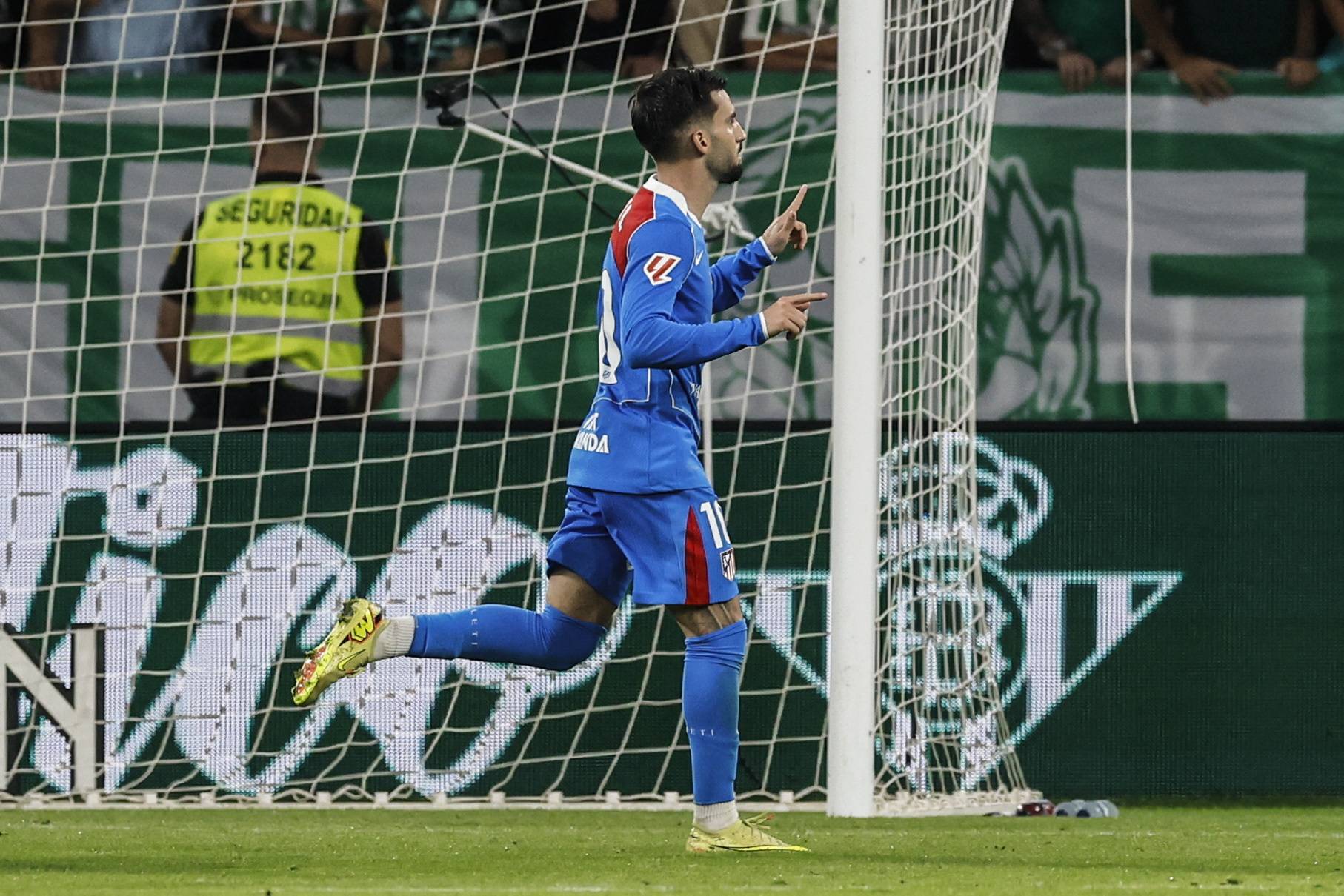 10月27日,马德里竞技队球员西蒙尼庆祝攻入球队首球。 新华社/欧新